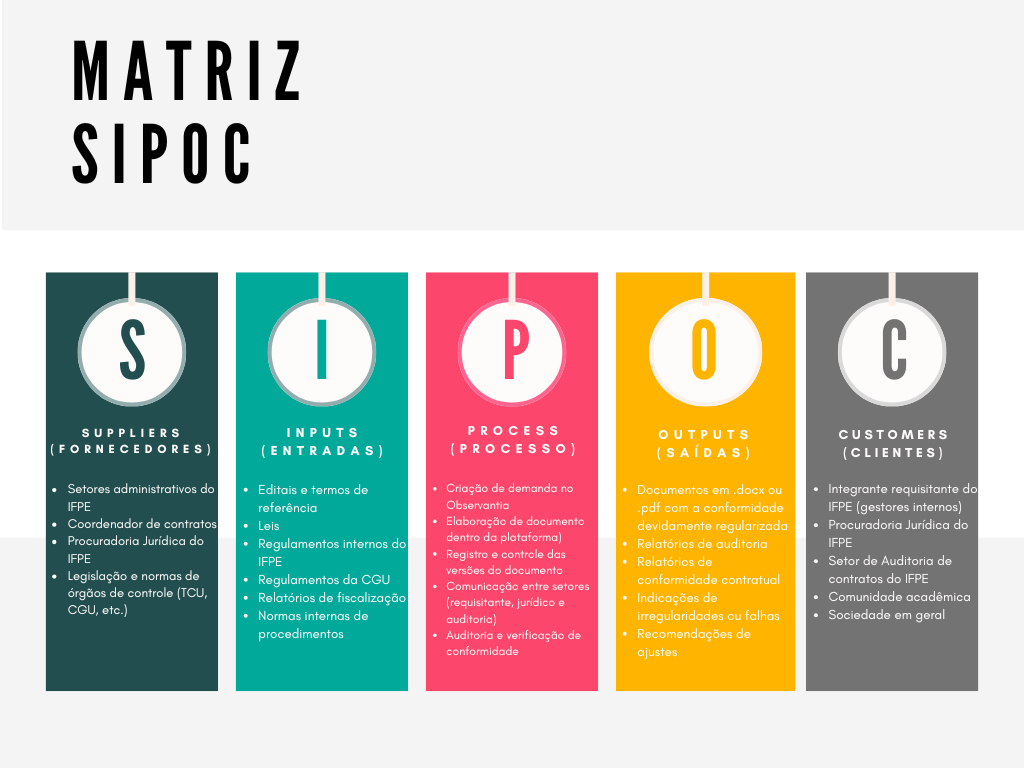 Supplier, Input, Process, Output, Customer - Análise completa de processos e stakeholders.
